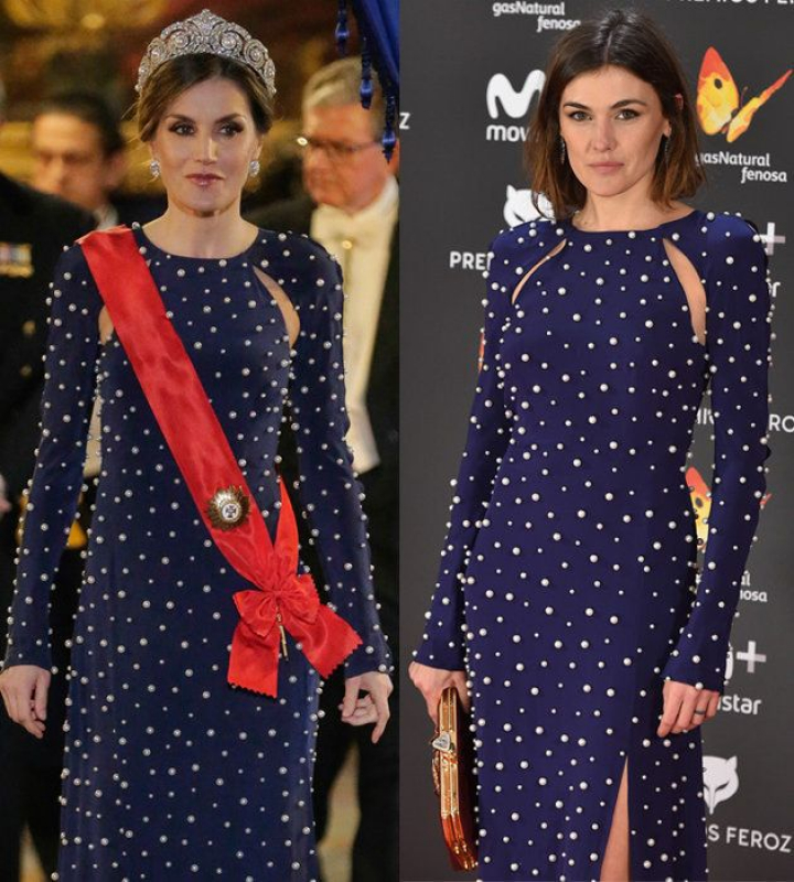 El vestido que lució doña Letizia era un estilismo rompedor que ya lució la actriz Marta Nieto en los premios Feroz 2017. Se trata de un vestido estilo sirena, con manga larga, cuello a caja y color azul noche que incorpora perlas bordadas en relieve y unas aberturas estratégicas en la parte del pecho, la espalda los brazos.