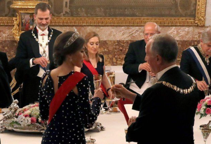 El Palacio Real de Madrid se vistió de gala este lunes para recibir al presidente de Portugal, Marcelo Rebelo de Sousa. Don Felipe y doña Letizia fueron los encargados de presidir la tradicional cena de gala.