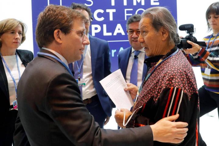 Su nombre es Mario Ágreda, es delegado del movimiento indio de América y se ha convertido en el protagonista del día en la Cumbre del Clima en Madrid por enfrentarse al alcalde de la capital.