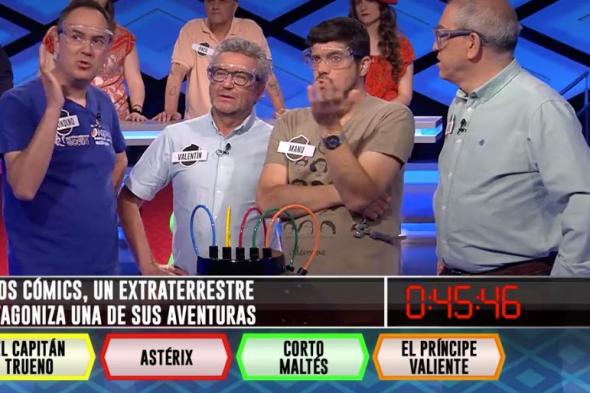 Alberto, Manu, Erundino y Valentín han perdido a un miembro del equipo tras responder mal a la siguiente cuestión: “En los cómics, un extraterrestre protagoniza una de sus aventuras”.