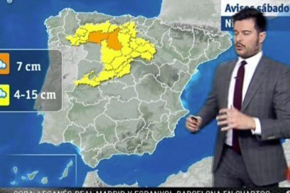 Martín Barreiro comienza a explicar el mapa del tiempo, en el que se ven tonos morados, azules y blancos que destacan la cantidad de nieve y lluvia que caerá este fin de semana en la península.