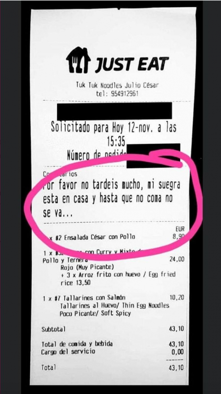 Lo que no esperaba un restaurante de Sevilla especializado en comida asiática es que alguien dejase un comentario de este tipo: “Por favor no tardéis mucho, mi suegra esta en casa y hasta que no coma no se va”.