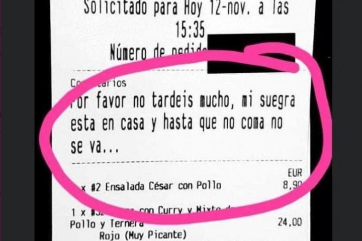 Soy Camarero, la cuenta especializada en temas de hostelería que triunfa en Twitter, ha compartido parte del ticket en la que se puede leer la curiosa frase dedicada a la madre de su pareja.