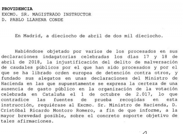 El juez Llarena pide a Montoro que explique por qué dice que no se utilizó dinero público para el 1-O