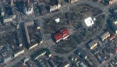Una manta cubre el cadáver de una persona fallecida en el bombardeo de la plaza central de Járkov
