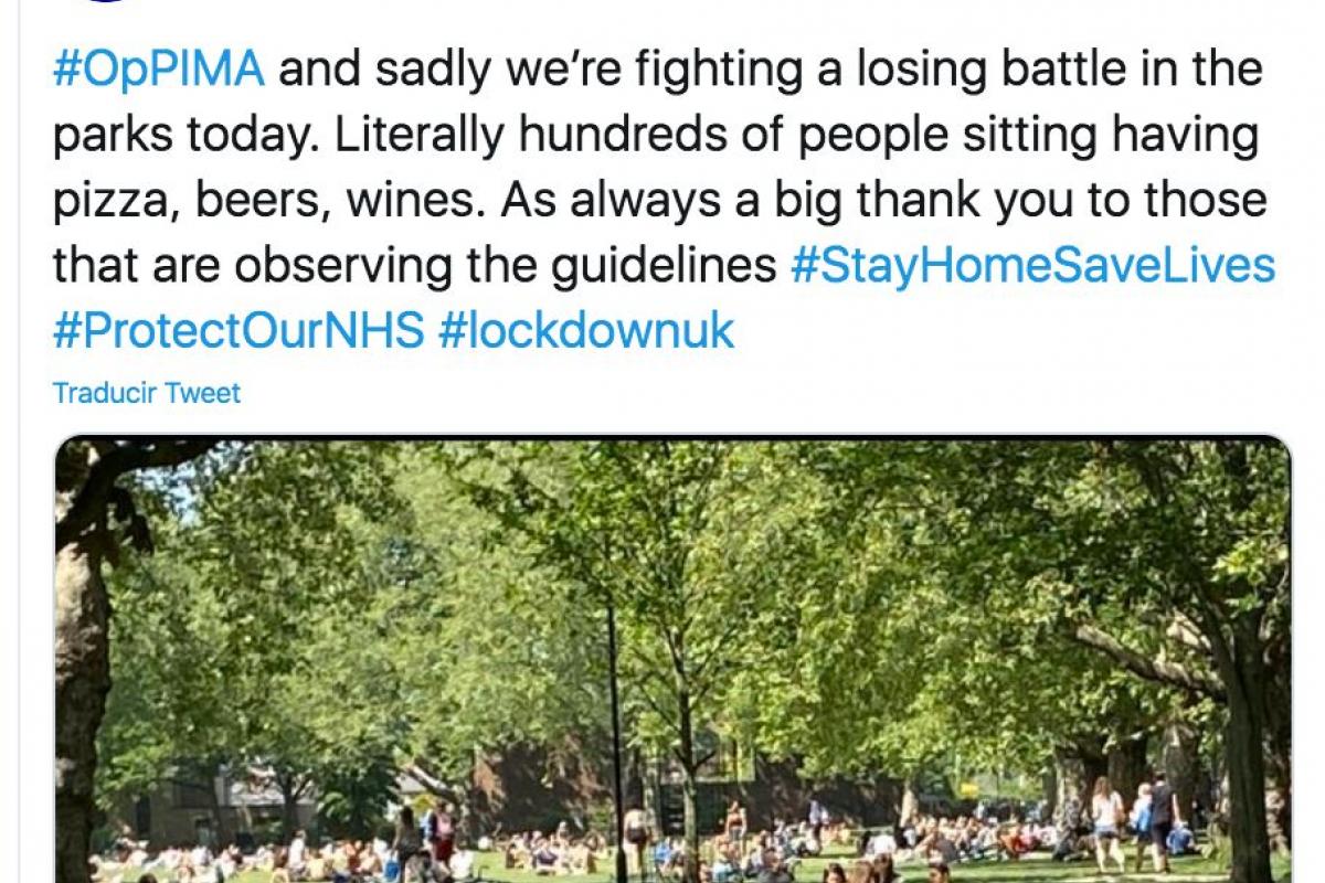 “Tristemente hoy estamos peleando una batalla perdida en los parques”, indica el cuerpo policial en su cuenta de Twitter, donde han compartido la fotografía de uno de esos parques atestado de gente.