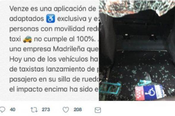 "Venze es una empresa que tributa todo aquí. Hoy uno de sus vehículos ha recibido por parte de taxistas lanzamientos de piedras con pasajero en su silla de rueda atrás montado. El impacto encima ha sido en la parte trasera", apunta en el mensaje.