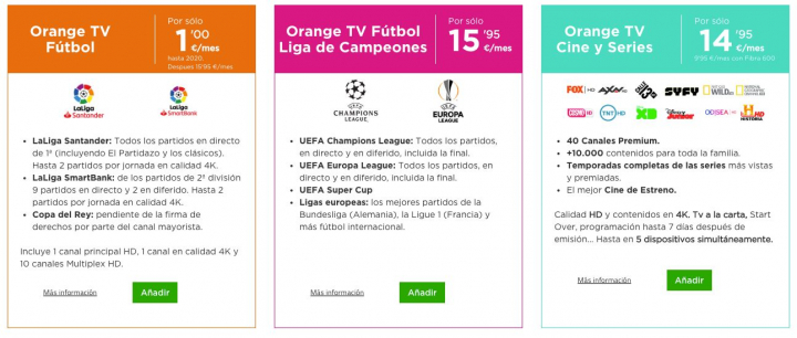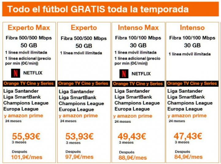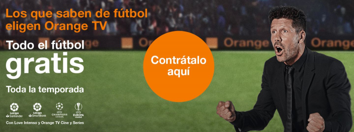 Al igual que su rival, Orange ofrece los partidos de la primera y la segunda división de fútbol y de las competiciones europeas a aquellos clientes que tengan contratados los paquetes convergentes más caros (Intenso, Intenso Max, Experto y Experto Max). El precio de estos paquetes parten de los 85 euros mensuales.