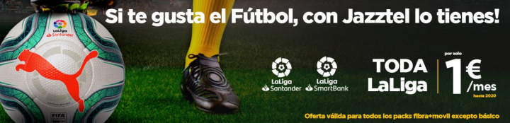 Jazztel —la marca de bajo coste de Orange— ha lanzado una oferta para que los clientes del operador puedan disfrutar del fútbol por solo 1 euro más al mes hasta el 1 de enero de 2020 y después 15,95 euros al mes.