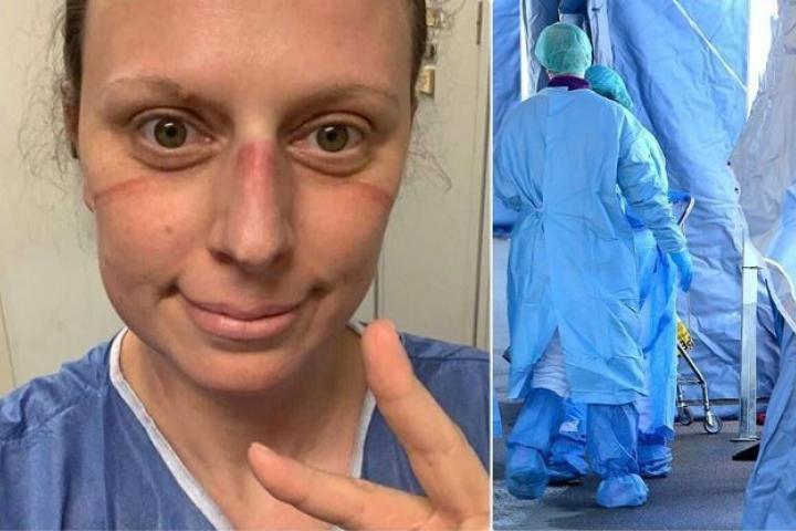 La sanitaria muestra las marcas que le ha dejado la mascarilla en la cara.