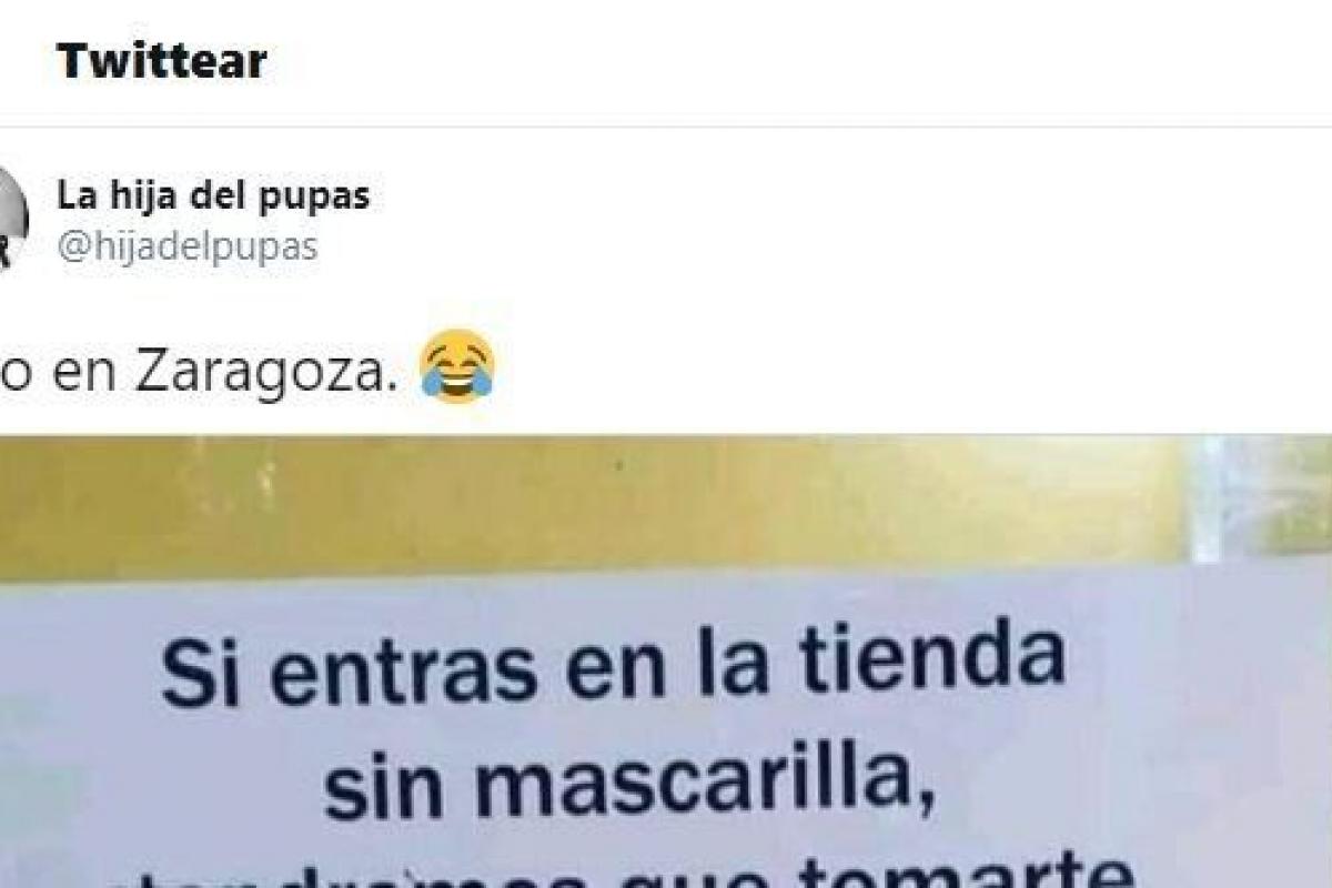 De ahí que muchas tiendas estén afilando el ingenio para recordar a sus clientes que tienen que entrar con mascarilla. El último ejemplo lo ha dado un local de Zaragoza, que ha colocado en su escaparate un letrero que no pasa desapercibido.