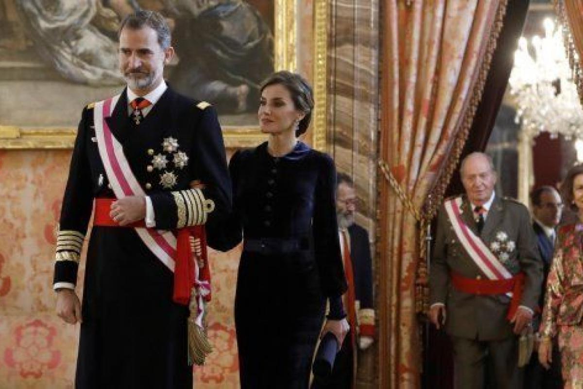 La reina Letizia ha vuelto a confiar en su diseñador estrella para la Pascua Militar de este 2018, el primer acto oficial del año para los Reyes. Letizia ha lucido un vestido largo de Felipe Varela en terciopelo azul oscuro. Un diseño que simula ser un dos piezas, con botones hasta el cuello, ceñido en la cintura y con los hombros marcados.