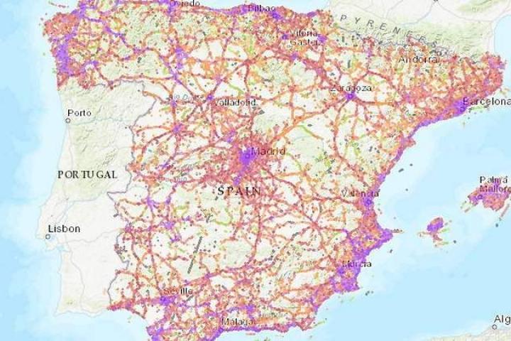 El mapa cuenta con diferentes colores que representan a cada red móvil: azul para 2G, verde para 3G, naranja para 4G, rojo para 4G+ y violeta para 5G. Así se podrá ver con claridad el tipo de cobertura que se encontrará dentro de cada calle, barrio y ciudad de España.