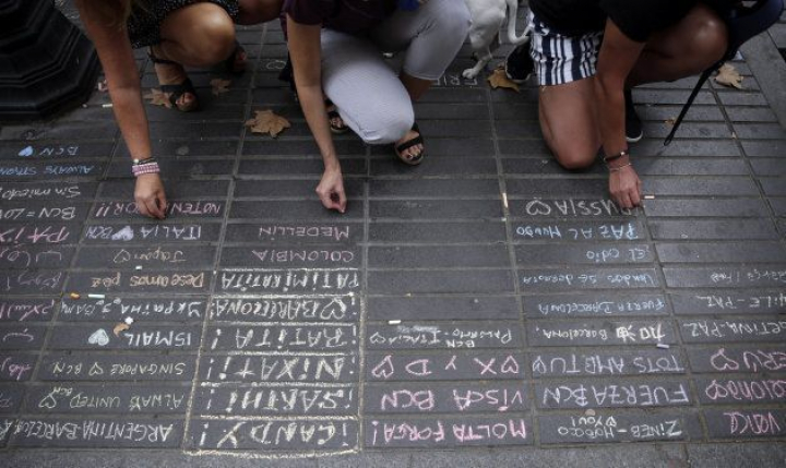 De forma espontánea, numerosas personas están escribiendo con tiza una multitud de mensajes de apoyo en una acera de las ramblas.
