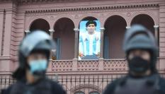 La leyenda argentina con una pequeña réplica del trofeo de la Copa del Mundo en el el balcón de la casa de gobierno después de una reunión con el presidente de Argentina, Alberto Fernández.