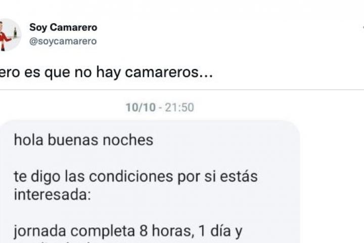 “Pero es que no hay camareros...”, ha escrito junto al pantallazo, en el que se ven las condiciones que ofrece el empresario: “Jornada completa 8 horas, un día y medio de descanso. 900 euros. Damos de alta media jornada”.