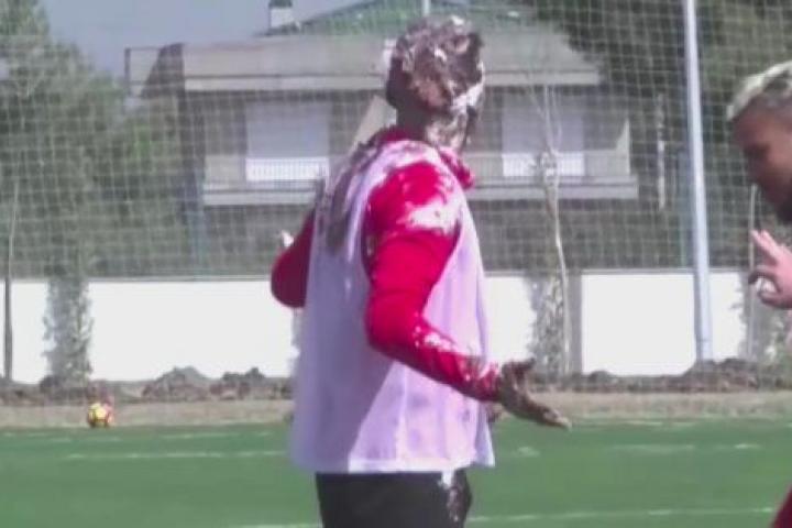 Después de cortarla y probarla —y cuando iba a comerse un trozo— los jugadores empezaron a lanzarle porciones de tarta a Eto'o.