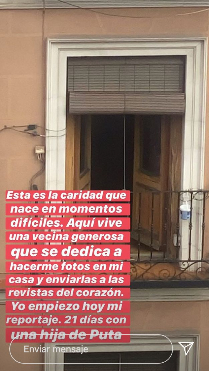 “Esta es la caridad que nace en momentos difíciles. Aquí vive una vecina generosa que se dedica a hacerme fotos en mi casa y enviarlas a las revistas del corazón. Yo empiezo hoy mi reportaje: 21 días con una hija de puta”, escribe el actor con ironía junto a una foto del balcón de la vecina.