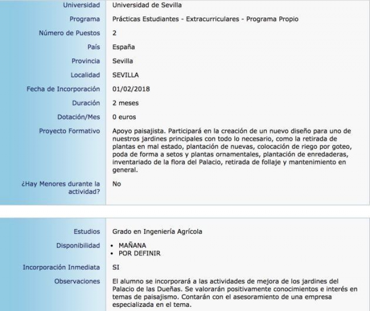 Los escogidos deben encargarse de "la creación de un nuevo diseño para uno de los jardines principales". Además de trabajar en "la retirada de plantas en mal estado, plantación de nuevas, colocación de riego por goteo, poda de forma a setos y plantas ornamentales, plantación de enredaderas, inventariado de la flora del Palacio, retirada de follaje y mantenimiento en general".