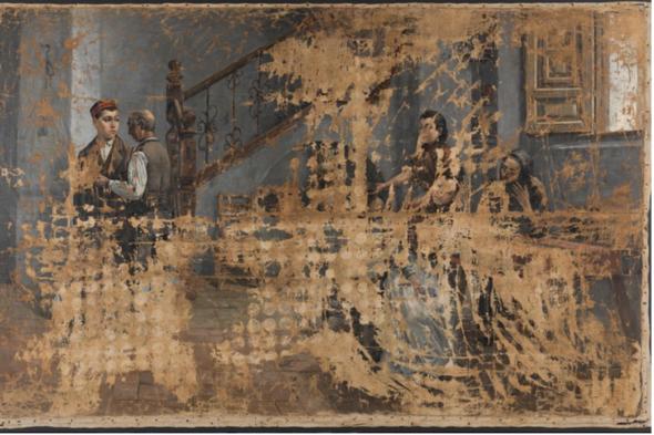 Se trata obra Escena de familia, que estaba atribuida en la muestra a Concepción Mejía de Salvador y que correspondería en realidad a Adolfo Sánchez Megías (1864-1945).