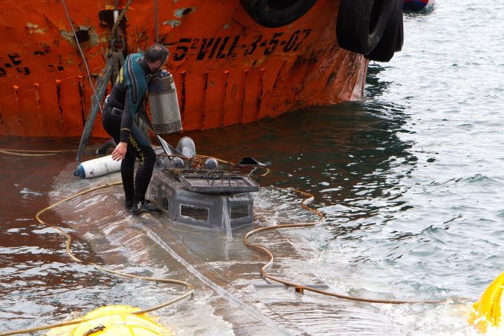 El sumergible, desde el que los narcotraficantes pretendían traspasar la droga a otra embarcación, ha sido reflotado en las últimas horas en el puerto de Aldán (Cangas).