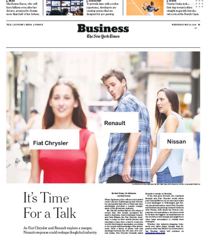 El prestigioso periódico estadounidense The New York Times ha decidido utilizar la famosa fotografía del novio distraído en la portada de la sección de economía de la edición impresa. El diario trata de ilustrar la reacción de la compañía automovilística Nissan tras la propuesta de fusión del grupo Fiat Chrysler a su socio, el grupo Renault.