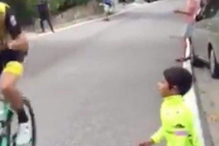 Se trata de un vídeo grabado durante la última Vuelta a España, que ganó el británico Simon Yates, en el que se ve cómo el ciclista del equipo Team LottoNL-Jumbo George Bennettestá en plena subida a un puerto. A su lado aparece un niño que le anima con muchas ganas.