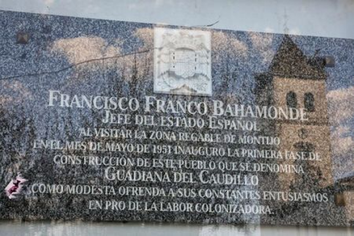 En concreto, la placa y el águila de San Juan que están en la fachada del Ayuntamiento. La placa recuerda que Francisco Franco inauguró en mayo de 1951 la primera fase de construcción de este pueblo.