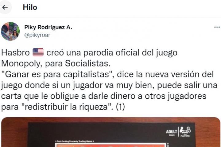 Hasbro 🇺🇸 creó una parodia oficial del juego Monopoly, para Socialistas. "Ganar es para capitalistas", dice la nueva versión del juego donde si un jugador va muy bien, puede salir una carta que le obligue a darle dinero a otros jugadores para "redistribuir la riqueza". (1) pic.twitter.com/CS1TyiG335