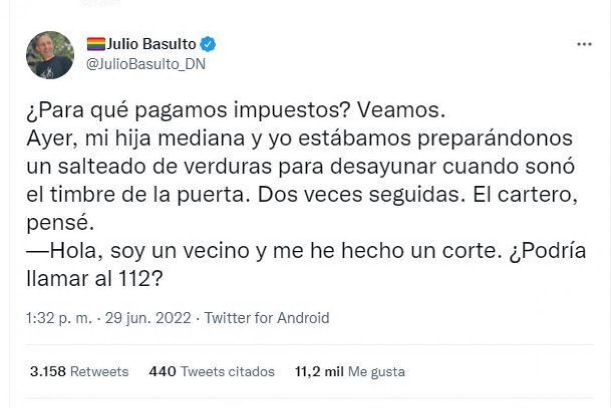 Basulto resalta que, en total, se movilizaron dos operadores, cinco profesionales sanitarios, dos policías, un coche del SEM, el coche de policía, una ambulancia y un helicóptero. “Para eso, entre otros muchos motivos, pagamos impuestos”, concluye en unos mensajes que en un día superan los 11.200 ‘me gusta’ y los 3.000 retuits.