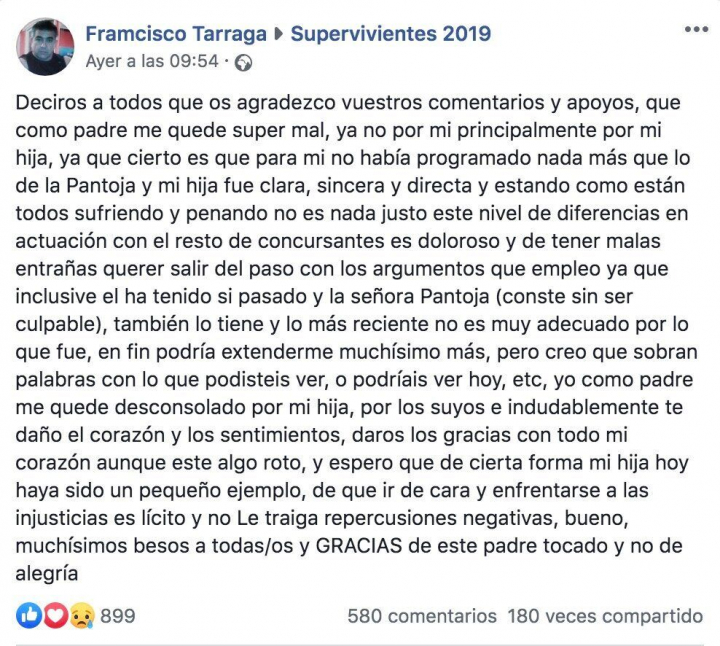 “Para mí no había nada programado, nada más que lo de la Pantoja”, afirma en su escrito: “Mi hija fue clara, sincera y directa y estando como están todos sufriendo y penando, no es nada justo este nivel de diferencias con el resto de concursantes”.