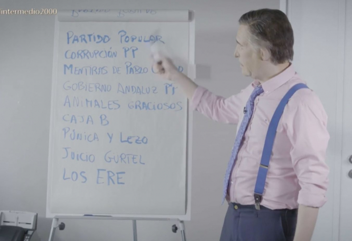 En ese momento, el falso Wyoming muestra la escaleta de un programa y los temas que se tratarán, que pasan por el “Partido Popular, la corrupción en el PP, las mentiras de Pablo Casado, el Gobierno andaluz del PP, animales graciosos, la caja B, la Púnica y la Lezo, el juicio de la Gürtel y los ERE...”.