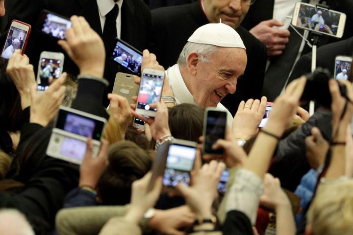 El papa Francisco, fotografiado por decenas de móviles a su llegada a una audiencia general en el Vaticano, en febrero de 2017. ASSOCIATED PRESS