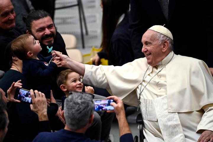 El Papa Francisco agarra el chupete de un bebé durante la audiencia general semanal en el Aula Pablo VI, Ciudad del Vaticano, el 14 de diciembre de 2022.EFE/RICCARDO ANTIMIANI