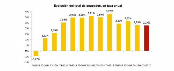 Se crea poco empleo pero de algo mejor calidad. El total de asalariados baja este trimestre en 44.600. Los que tienen contrato indefinido aumentan en 78.000, mientras que los que tienen contrato temporal disminuyen en 122.600. En variación anual, el número de asalariados aumenta en 405.600 (el empleo indefinido se ha incrementado en 195.600 personas y el temporal en 210.100). El número de trabajadores por cuenta propia baja en 23.800 este trimestre, mientras que en los 12 últimos meses ha crecido en 1.100 personas.