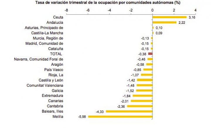 En el mapa de España, Andalucía, Madrid y Cataluña lideran la creación de empleo: con 116.800, 95.300 y 83.300 parados menos cada una, estos tres meses del año. Las mayores pérdidas, por contra, se observan en Cataluña (18.200), Illes Balears (16.700) y Galicia (12.900). En términos anuales, el descenso del paro es general. Las mayores reducciones se producen en Andalucía (116.800 parados menos), Comunidad de Madrid (95.300) y Cataluña (83.300).