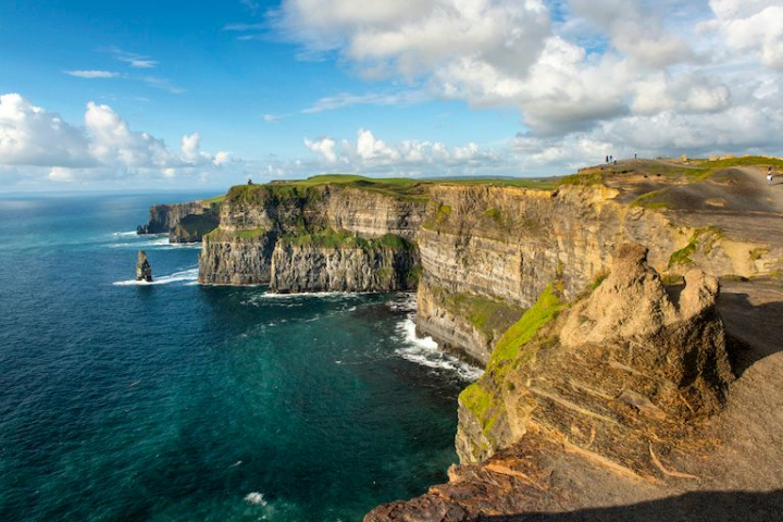 El paisaje kárstico lunar de Burren es como un país de las maravillas de casi 560 km cuadrados de piedra caliza poblados por una extraordinaria combinación de plantas mediterráneas y ártico-alpinas y especies de flores silvestres irlandesas. Al suroeste se encuentran los magníficos Acantilados de Moher de 214 metros de altura, un espectacular desfile de arenisca oscura y limolitas.