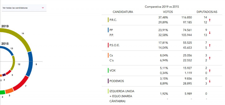 El PSOE sube de 5 a 7 diputados; Ciudadanos sube de 2 a 3; Vox entra en el Parlamento de Cantabria con dos diputados; y Podemos, que tenía tres, se queda fuera.