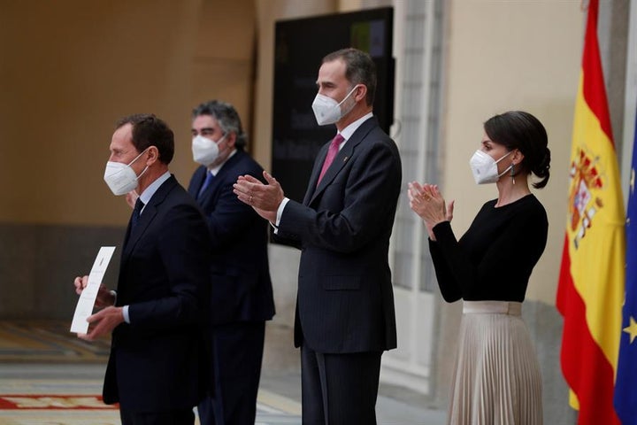El moño deja ver los pendientes, que la reina ha estrenado con motivo de la entrega de premios. Se trata de un diseño en color azul y con forma de cordón de la firma malagueña Rod Almayate.