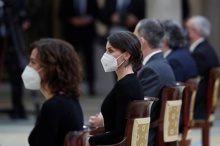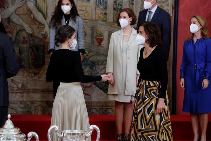 Lo que habría sido una acertada elección para un acto de día jugó una mala pasada a la reina, ya que, como se puede apreciar en el vídeo de la ceremonia y en las imágenes distribuidas por la agencia EFE, el moño ha terminado soltándose, dejando un mechón colgando por el centro del recogido.