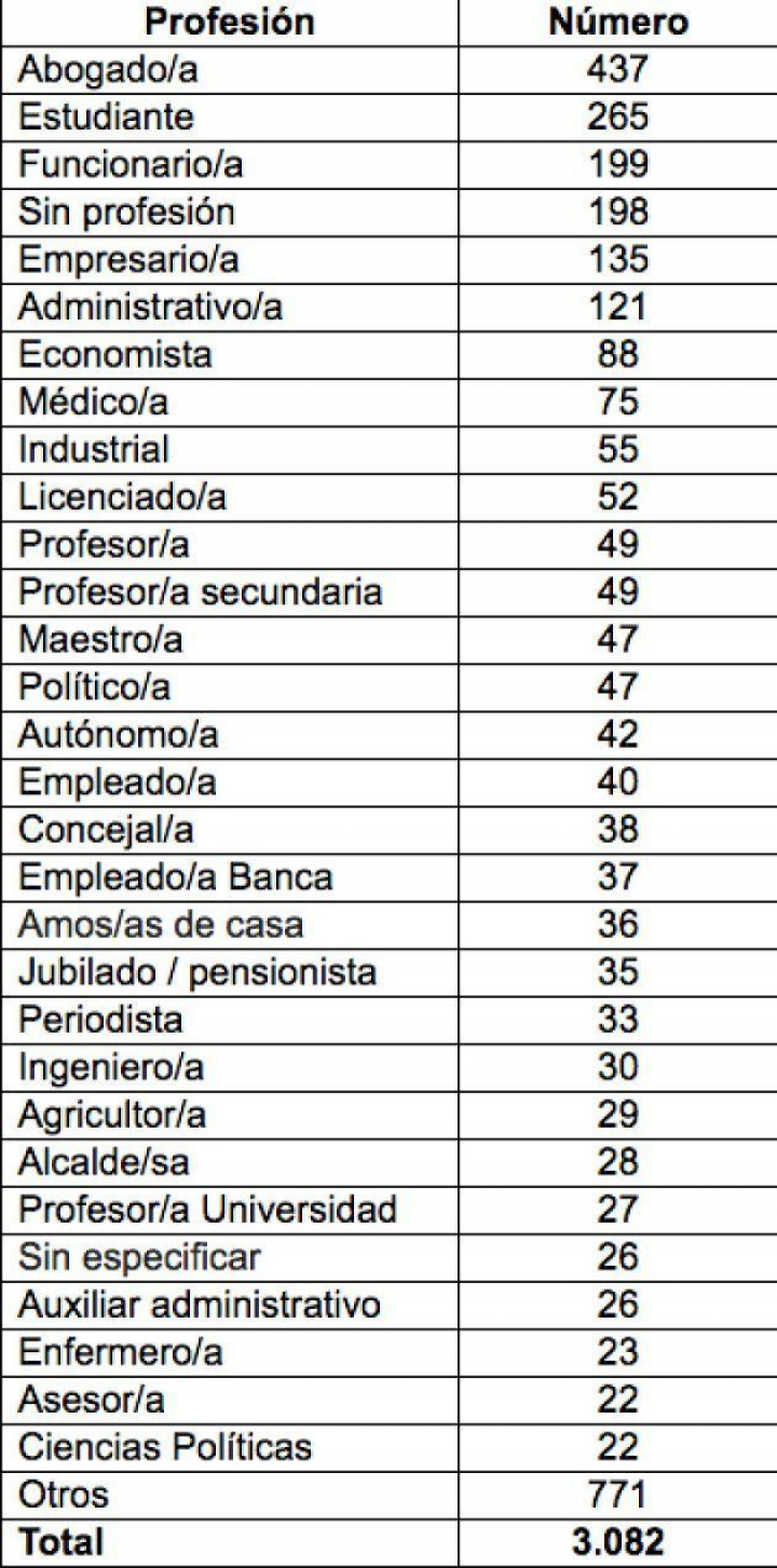 Por profesiones, ganan los abogados (437 delegados), por encima de los estudiantes (265) y los funcionarios (199). Luego aparece el grupo de los que se denomina "sin profesión", con 198 delegados. Detrás: administrativos (121), economistas (88), médicos (75), industriales (55), licenciados (52) y profesores (49).