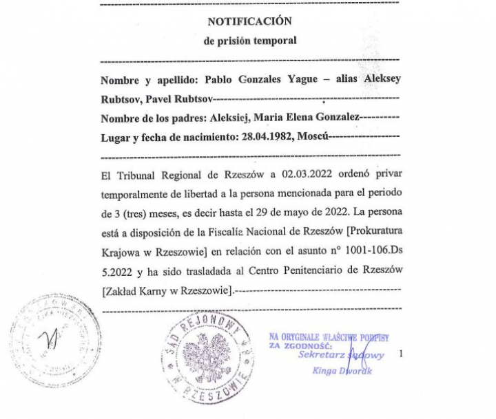 En la notificación de la Justicia polaca se identifica a Pablo Gonzales Yague [sic] con dos alias, Aleksey Rubtsov y Pavel Rubtsov. Rubtsov es el apellido de su padre, Aleksiej Rubtsov, y Pavel es el equivalente a “Pablo” en ruso.