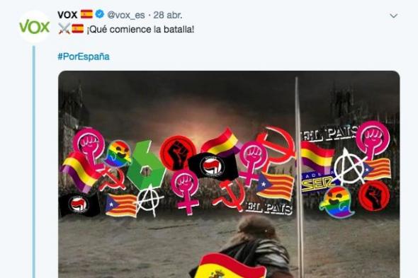 En este tuit, Vox era Aragorn —interpretado por el actor Viggo Mortensen— y los orcos de Sauron eran los “enemigos de España”, entre los que se encuentran la Cadena SER, El País, las feministas, los republicanos y un largo etc.