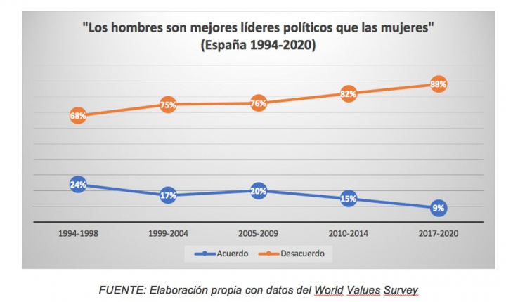 Hoy solo 1 de cada 10 españoles cree que los hombres son mejores líderes políticos que las mujeres, cuando hace apenas 25 años era 1 de cada 4. España ocupa el puesto número 14 en el ranking del más reciente estudio Global de Brecha de Género que realiza anualmente el Foro Económico Mundial, realizado entre 156 países.