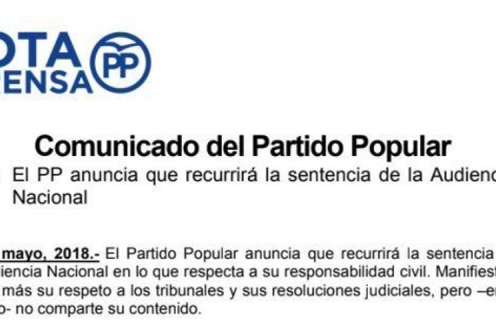 El Partido Popular ha anunciado que recurrirá la sentencia de la Audiencia Nacional que le condena a pagar una multa de 245.492 euros como partícipe a título lucrativo por su implicación en la trama Gürtel, cuya sentencia se ha conocido este jueves. En un comunicado tras conocer la sentencia el PP ha manifestado que "una vez más" muestra "su respeto a los tribunales y sus resoluciones judiciales", pero señala que "en este caso, no comparte su contenido".
