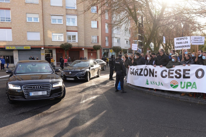En las imágenes se observan varios carteles en los que se puede leer “Garzón traidor” y “Respeto para los ganaderos” en protesta por las declaraciones del ministro de Consumo, Alberto Garzón, en The Guardian, donde defendió la ganadería extensiva y criticó las macrogranjas, algo que ha vuelto a hacer este domingo en El Periódico.