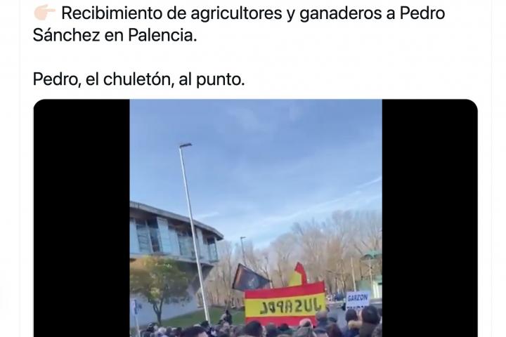 Con estas palabras compartía la cuenta de Twitter del PP de Madrid un vídeo de una protesta de ganaderos contra el presidente del Gobierno, Pedro Sánchez, durante su visita a Palencia, donde ha participado en un acto del PSOE de Castilla y León de cara a las elecciones de febrero.