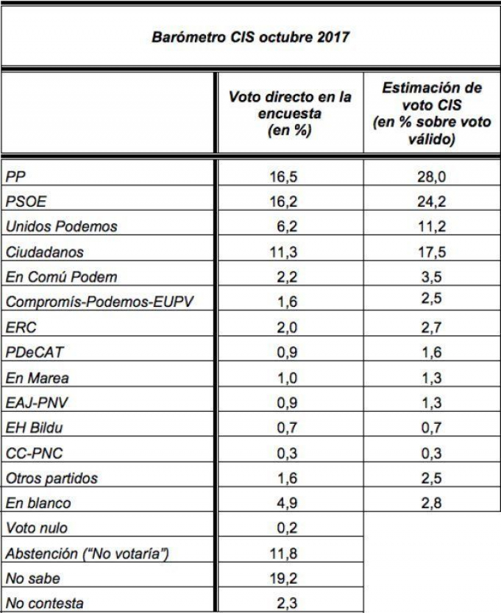 En este CIS, tras PP, PSOE, Unidos Podemos y Cs, se sitúan ERC (2,7%), PDeCAT (1,6%), PNV (1,3%), Bildu (0,7%) y CC (0,3%). Respecto a la encuesta de julio y tras el 1-O, las fuerzas independentistas bajan muy poco, dos décimas en el caso de Esquerra y una décima desciende el partido de Carles Puigdemont.