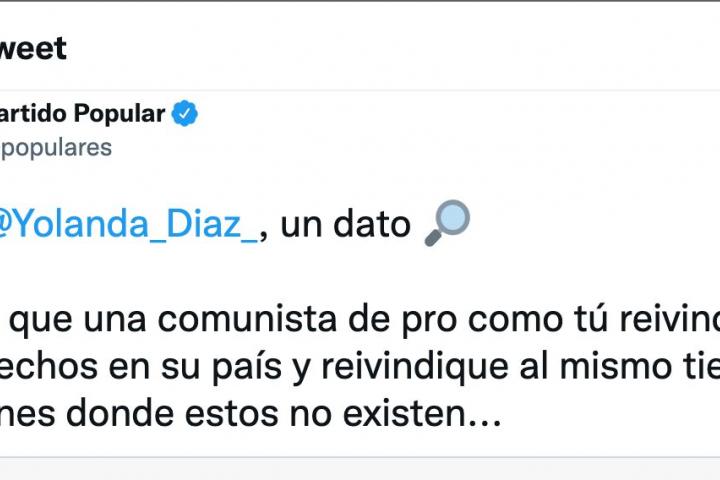 “Hola, Yolanda Díaz, un dato Es raro que una comunista de pro como tú reivindique los derechos en su país y reivindique al mismo tiempo regímenes donde estos no existen...”, ha escrito el PP.