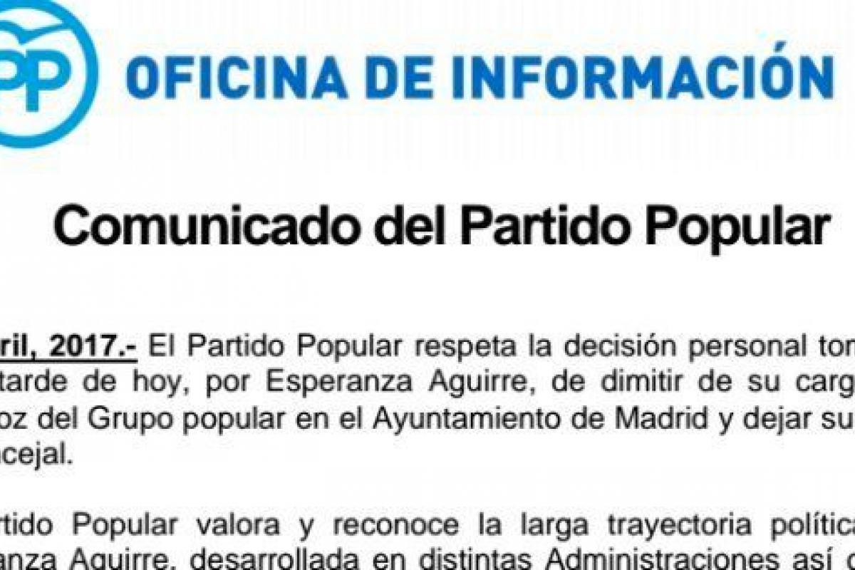 "El Partido Popular valora y reconoce la larga trayectoria política de Esperanza Aguirre, desarrollada en distintas Administraciones así como en el partido, y considera que ha sido una persona relevante para esta organización".